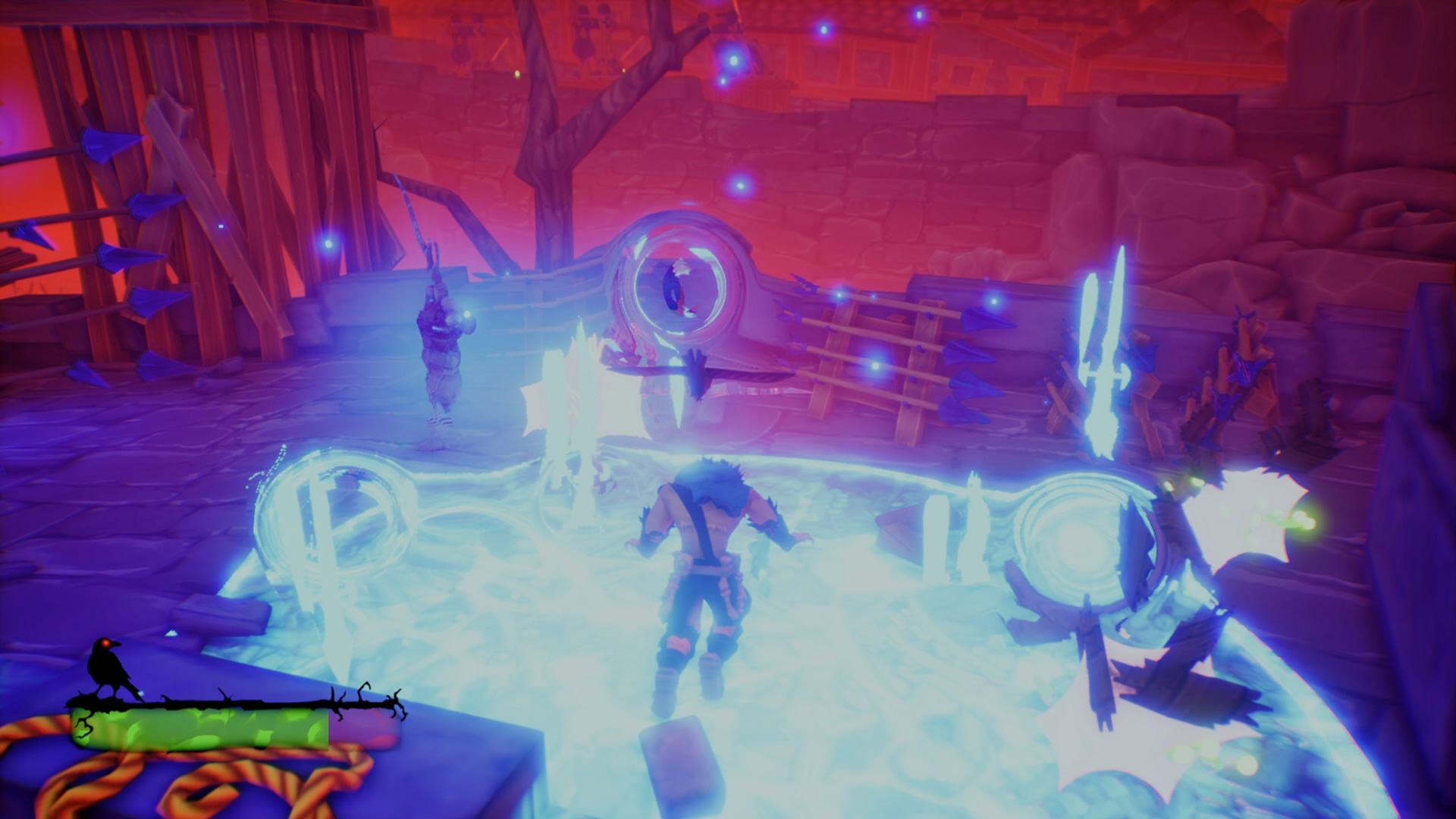 Mas esperem, estou a esquecer-me da melhor ferramenta no nosso arsenal, um magnífico e esbelto corvo que por acaso é o corvo mais medroso que tive o prazer de encontrar, mas eu não estava a brincar sobre ele ser uma das nossas melhores armas, porque com um toque de um botão, podemos mandá-lo atacar inimigos deixando-os atordoados por breves momentos, ou destruir objetos que nos estejam a impedir o nosso caminho.