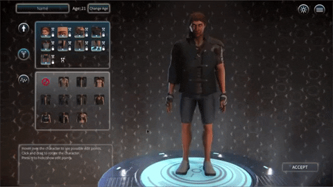 Em Eden Falling, a tua personagem é totalmente personalizável, mesmo para além da sua aparência. Personaliza o teu cabelo e cor de pele, rosto, sexo, roupa, idade e atributos, história, e até a tua política. Fica avisado, no entanto, que a tua aparência é importante e irá afectar aqueles que te rodeiam. Os teus atributos irão crescer e mudar à medida que a tua personagem envelhece, por isso escolhe sabiamente onde gastar os teus pontos.
